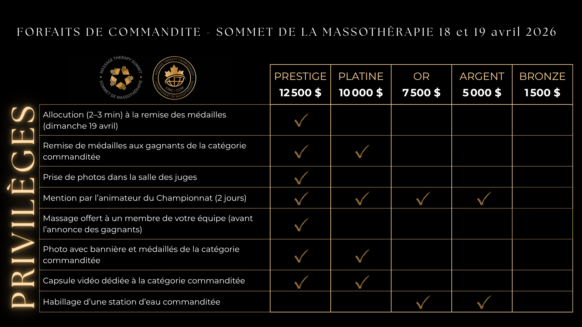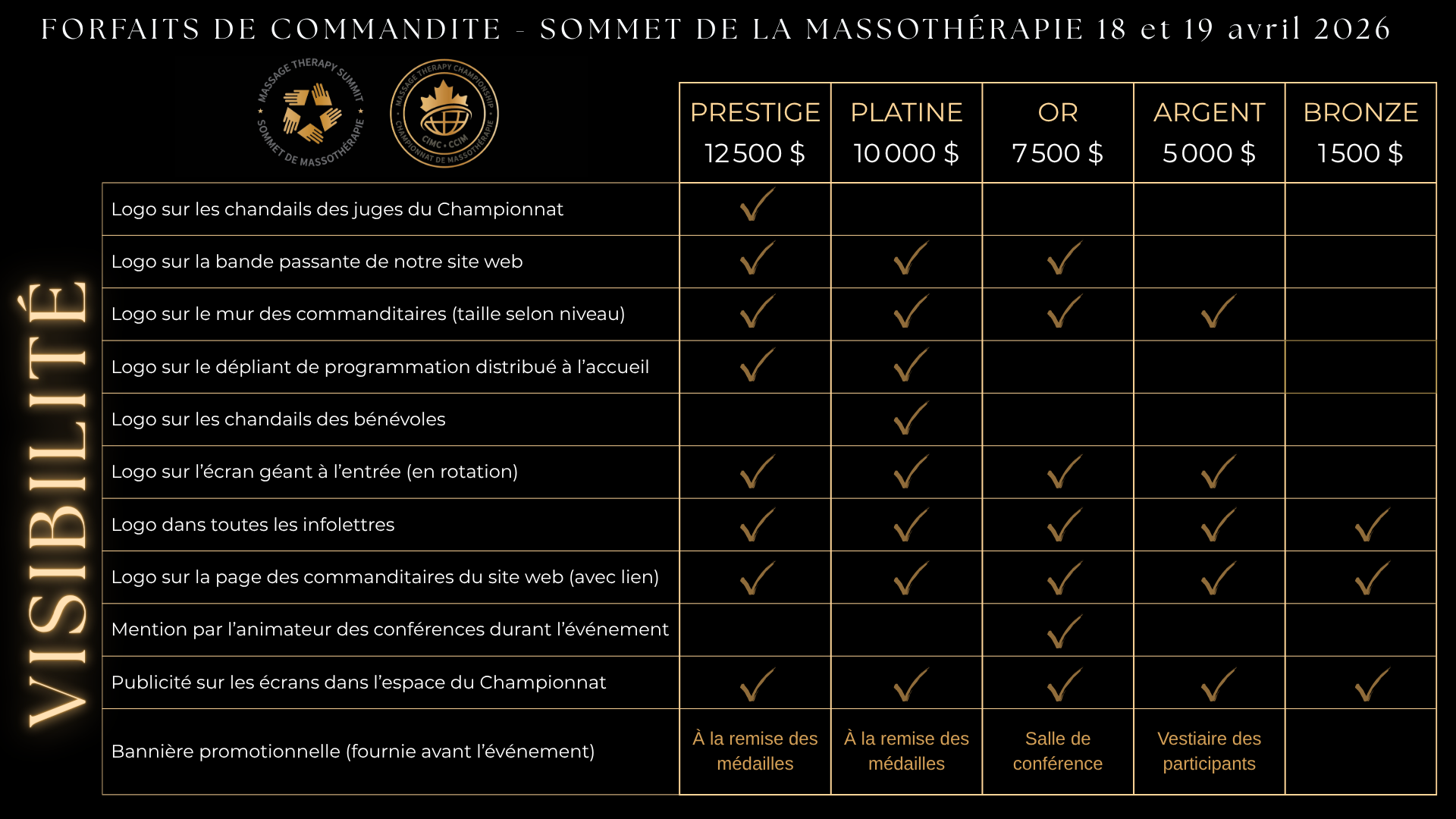 Un salon professionnel et diversifié comme le Sommet de la massothérapie, offre aux commanditaires une visibilité ciblée accrue : Le Sommet et les championnats attire un public de milliers de personnes curieuses et intéressées par le bien-être et le massage, des centaines de massothérapeutes, des professionnels de la santé, des spas et cliniques multidisciplinaires.